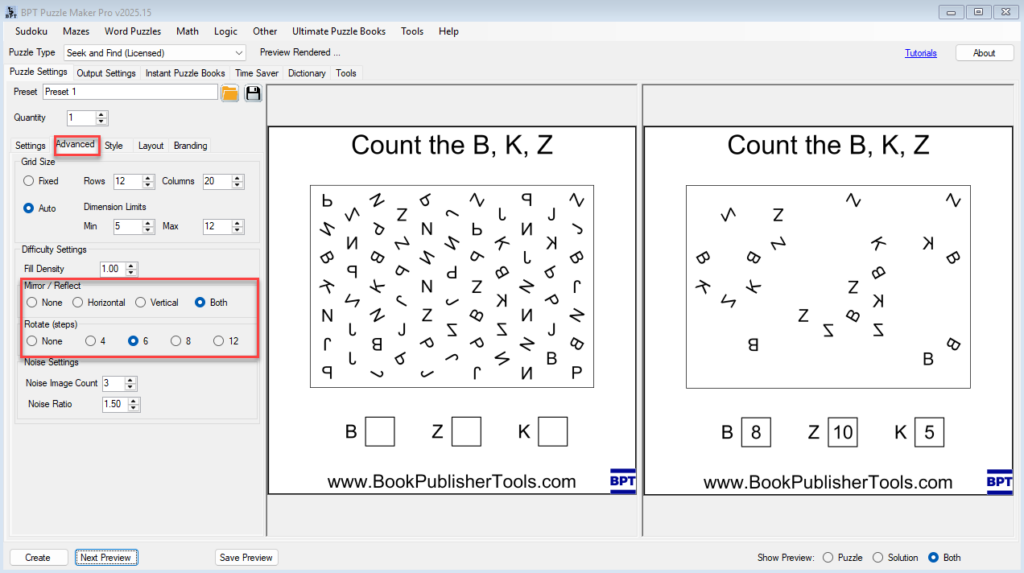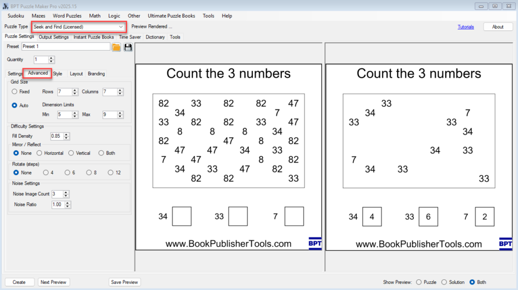 You’ll use the Settings and Advanced tabs to control puzzle size, symbol placement, and difficulty — ensuring your puzzles are fun and perfectly matched to your target audience.