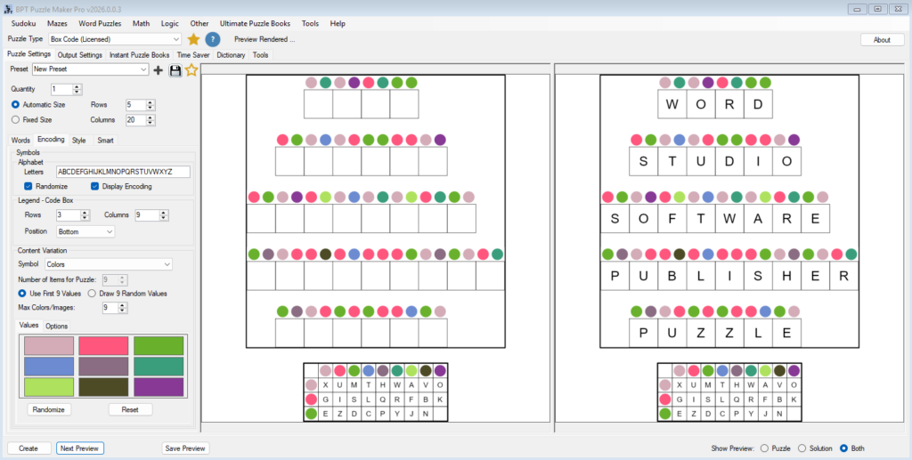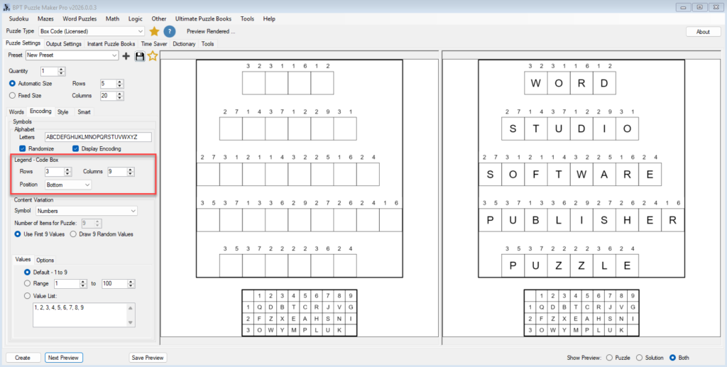 Use Next Preview to see how encoding changes affect the puzzle.