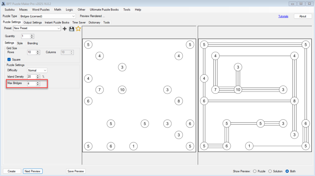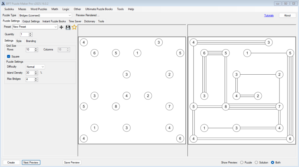 ⚡ Using Time Saver for Batch Bridges Puzzle Creation 🔍 Overview The Time Saver feature in Puzzle Maker Pro – Bridges Creator Edition lets you create multiple puzzles in one go, each with its own settings or style.Instead of generating one puzzle at a time, you can fill a table with different configurations — or