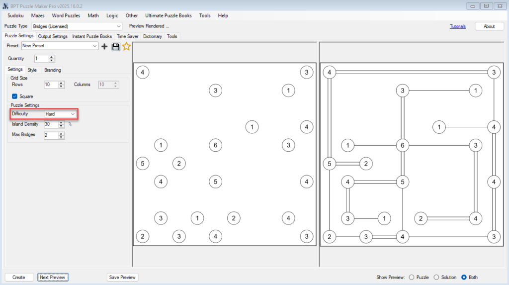 By adjusting a few simple parameters — grid size, density, difficulty, and maximum bridges — you can create an entire range of puzzles from relaxing beginner challenges to expert-level logic tests.