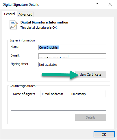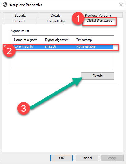 In the properties window, you should see a tab “Digital Signatures” (1). This means it’s signed with a digital certificate. When you click this line where it says “Core Insights” (2), the Details button should be enabled, and you can click this (3)