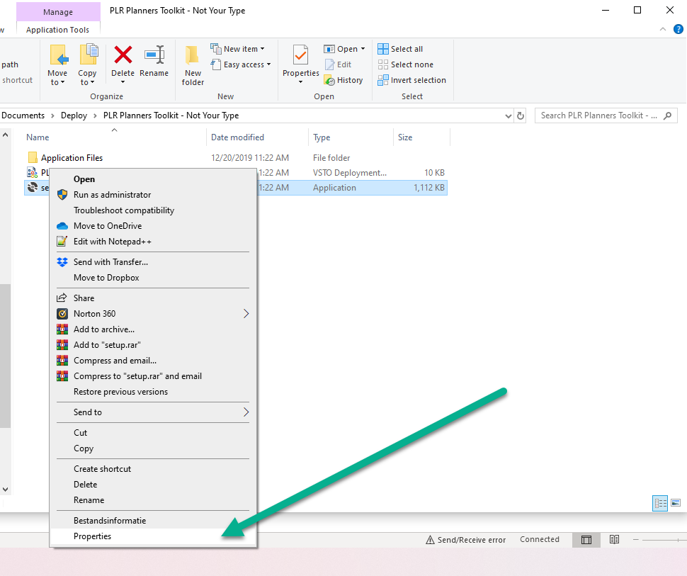 Right-click the setup file (setup.exe if you see the file extensions) and click Properties in the pop up menu