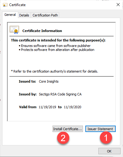 If you want to verify the authenticity of this certificate, you can click “Issuer Statement” (1), which will show you a page on the Sectigo website. (Sectigo is one of the worlds trusted organisation that issue certificate).