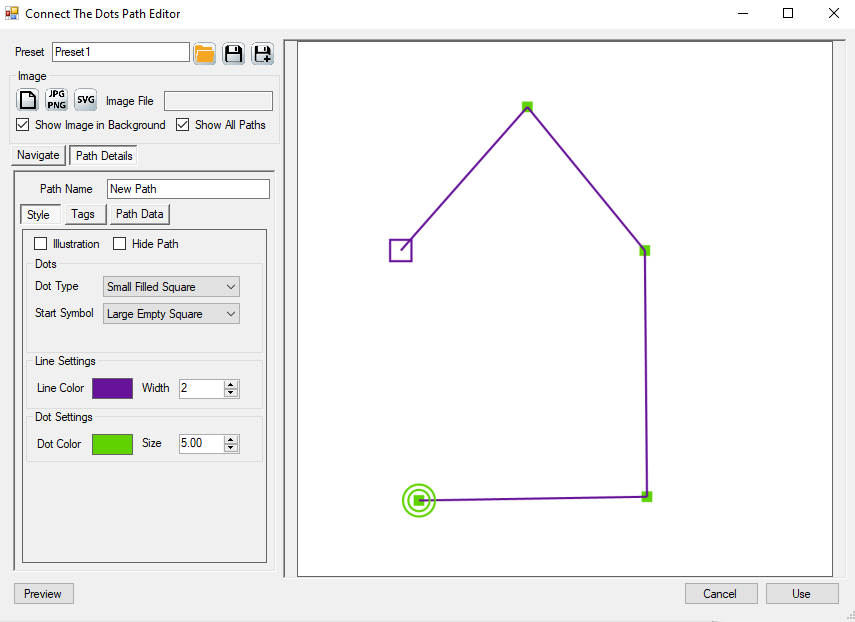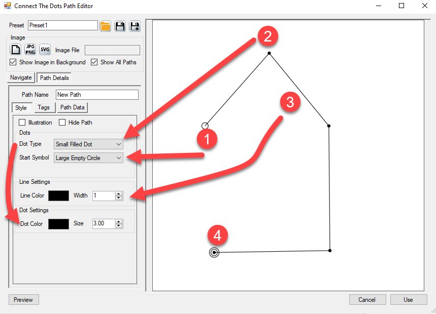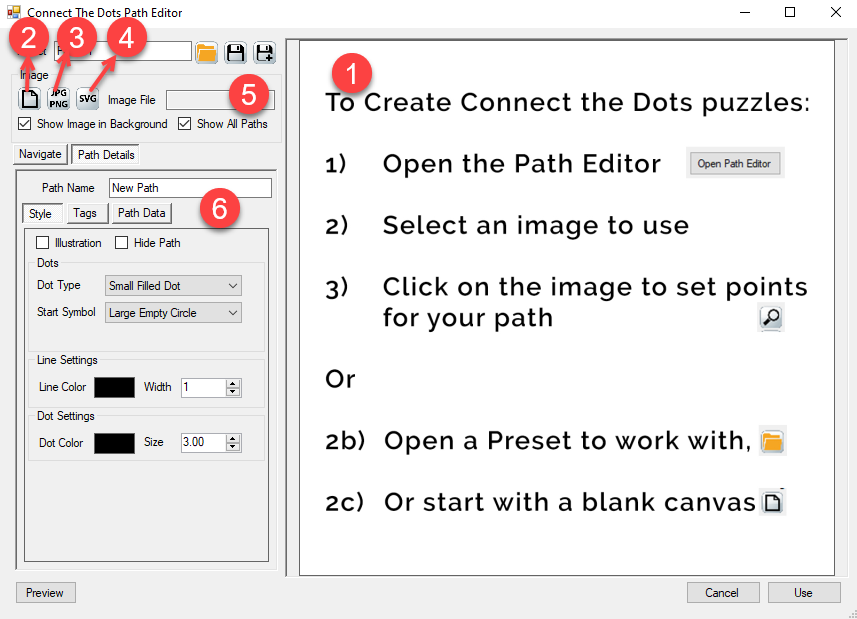 The preview panel contains brief instructions for Connect the Dots, telling you to Open the Path Editor (3)