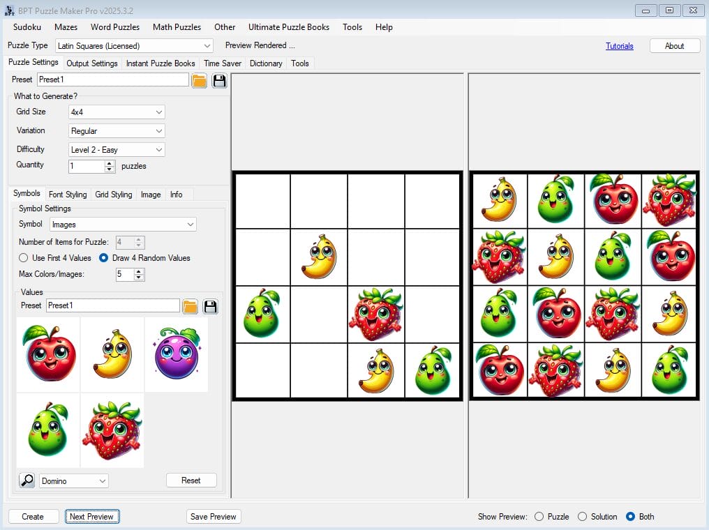 Want to make an eye-catching logic puzzle for a holiday, classroom, or themed book—fast? This tutorial shows you how to create a fully styled 4×4 or 5×5 Latin Squares puzzle in just a few minutes using Puzzle Maker Pro – Latin Squares Creative. You’ll use your own letters or images, pick your favorite colors, and create a print-ready puzzle that looks great.