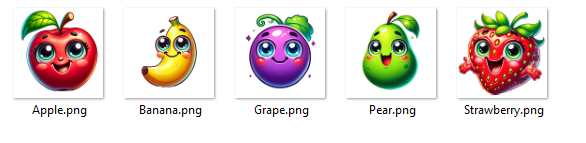 In this example, we use 5 playful fruit icons: a smiling strawberry, winking watermelon, happy pineapple, giggling grape, and cheerful cherry.