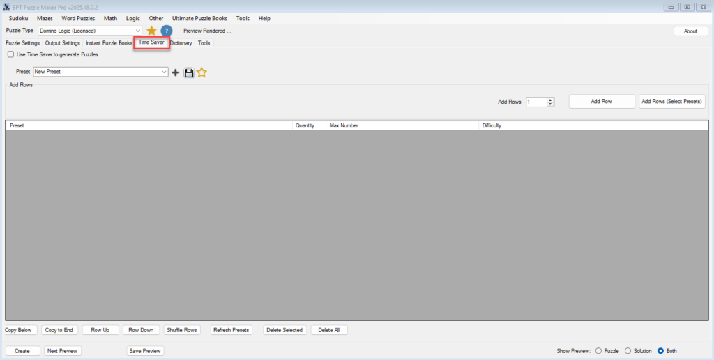 This tutorial explains how to use the Time Saver’s table layout to manage presets, control difficulty, and export entire puzzle books with one click.