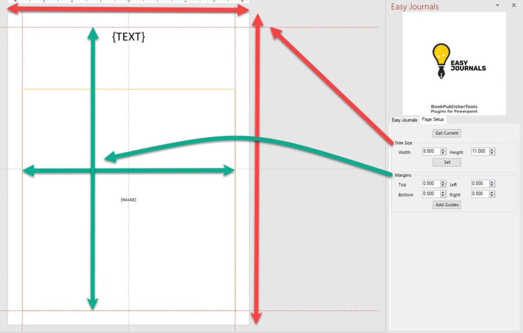 Powerpoint does not work with margins, because it’s an app to create presentations, not books. However, you can easily use guides to help you out here: Just set the margins the way you want to and click “Add Guides”. This will add four red guides – top, bottom, left, right.