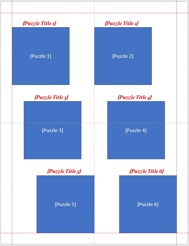 Here you can see the 6 different placeholders for puzzles, and 6 for puzzle titles. (You’d see the same type of placeholders on the solution template.