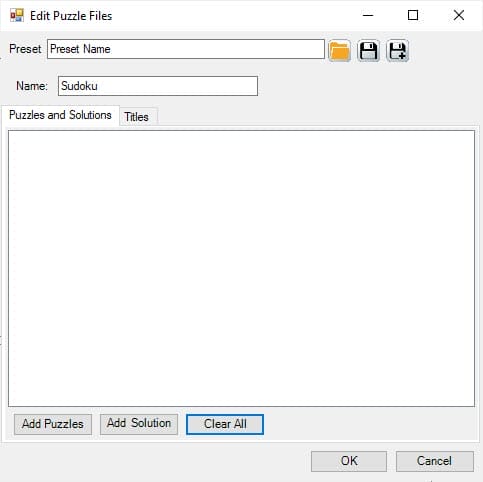 The screenshot shows the empty Puzzle Files window. This is what it will usually look like when you start, unless you have used a preset already.