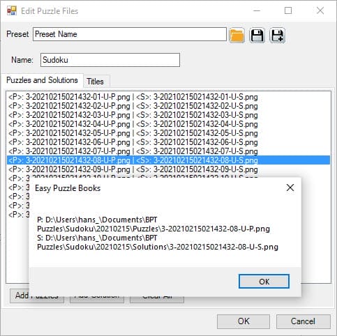 The puzzles and solutions will be displayed in the list. Especially for the first few puzzle books, it makes sense to verify that the proper puzzles and solutions are matched.