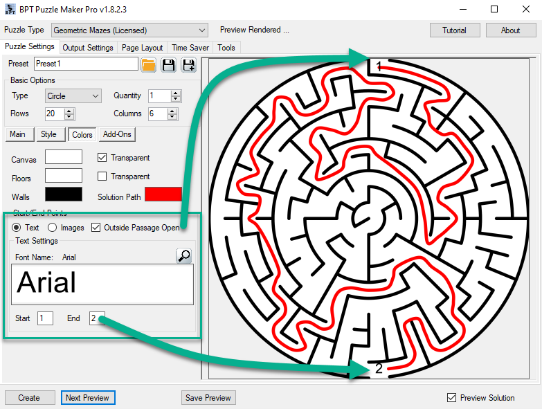 In Puzzle Maker Pro – Geometric Mazes you can fully customize the Start and End point indicators. By default these will be printed as Text (“S” for Start, “E” for End) in black, using the Arial Font style. You can change the font by clicking the font preview panel (which shows “Arial” in the screenshot below, or by clicking the small looking glass on top of the panel).