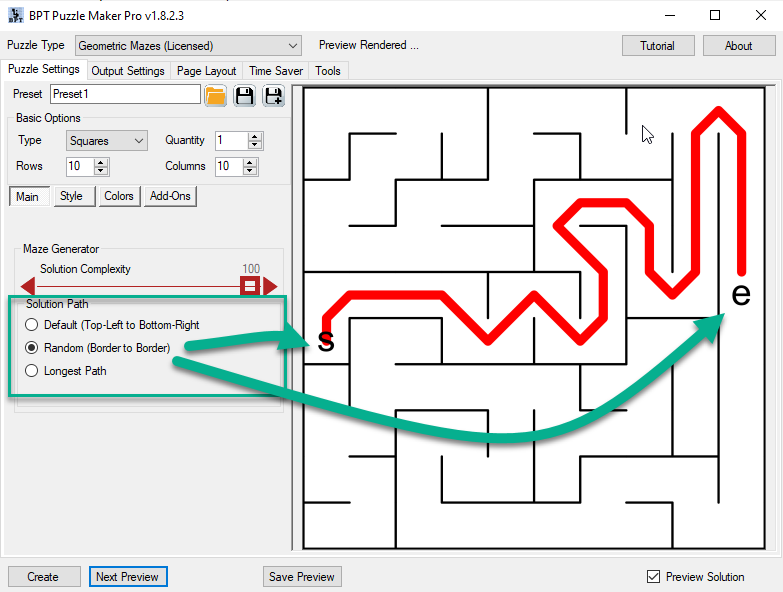 In the screen shot you can see the slider for “Solution Complexity”. When you slide it to the left, it will create straightforward paths, when you slide it to the right, the paths will be more complex. However, it’s always random.