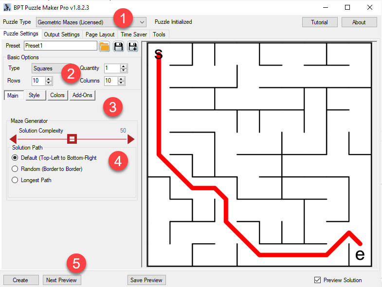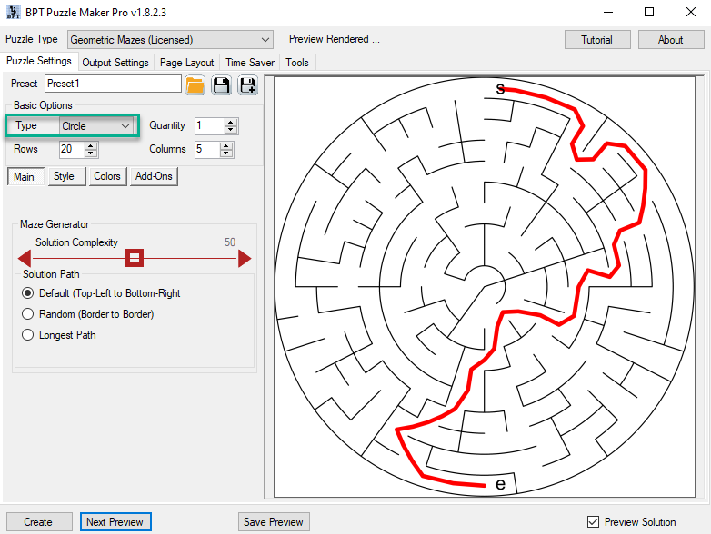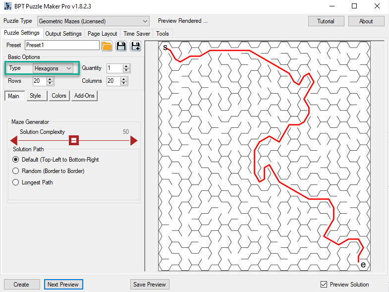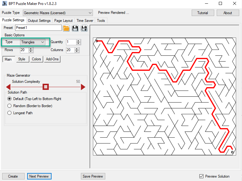 - “Preview Solution” can be used to toggle the preview panel from solution to puzzle. For mazes it’s usually convenient to preview the solution (otherwise you won’t see the solution path).