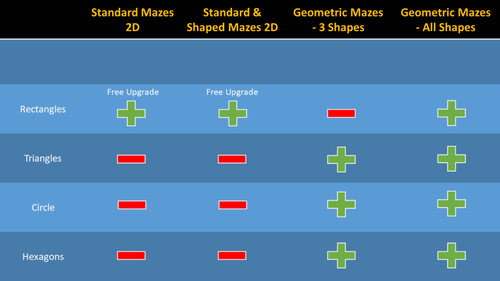 - “3 Shapes”, as a sidegrade/upgrade for owners of Standard Mazes 2D (or Standard & Shaped Mazes 2D). You can also buy this module if you don’t need the squares mazes at all.