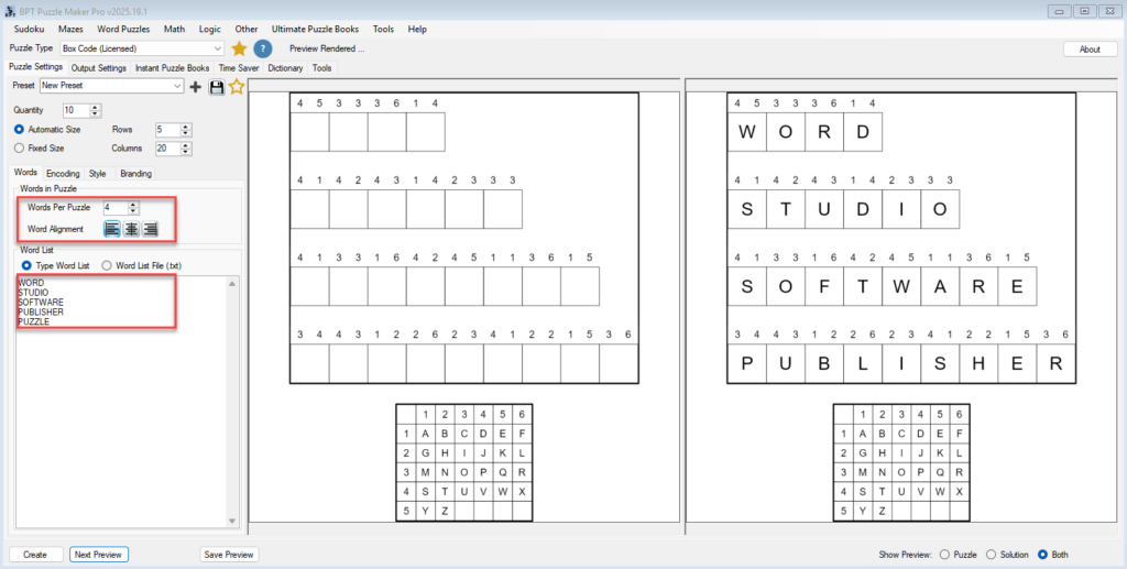 You will learn the basic workflow: entering words, choosing encoding, previewing the puzzle, and generating output.