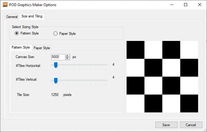 The options screen has two tabs: General, and Size and Tiling.
