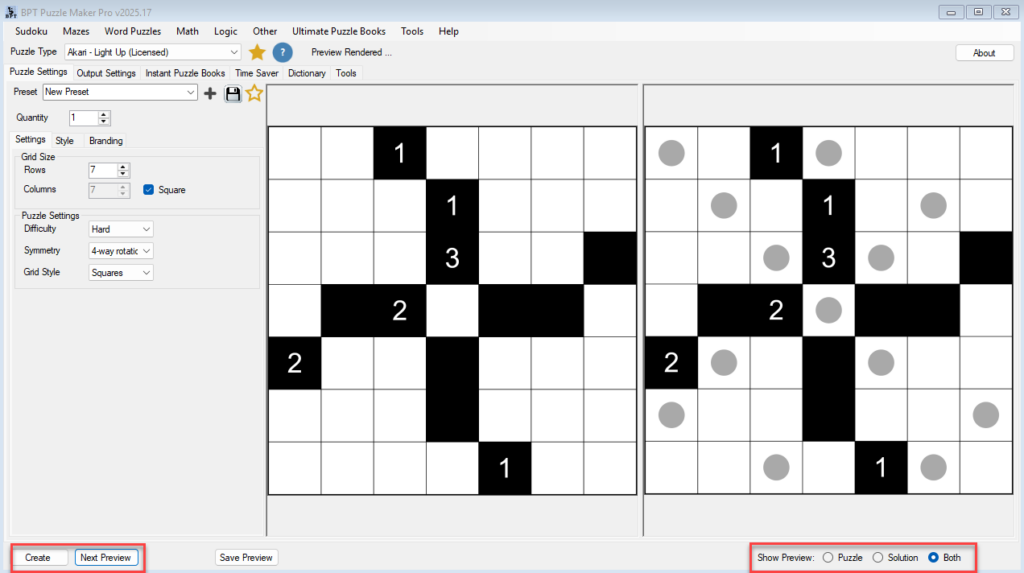 • Click Next Preview to generate a new puzzle and see both puzzle and solution side by side.