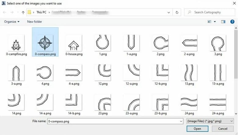 The pack shown here is a free Cartography Tiles Pack from Kenney. As you can see, we’ve renamed the files, with each file now starting with one or more numbers. The numbers indicate the sides of the square that are connected, with 0 having no connections, 12 meaning side 1 and 2 are connected, et cetera. For more information, you can always look at our tile format and naming conventions guide.