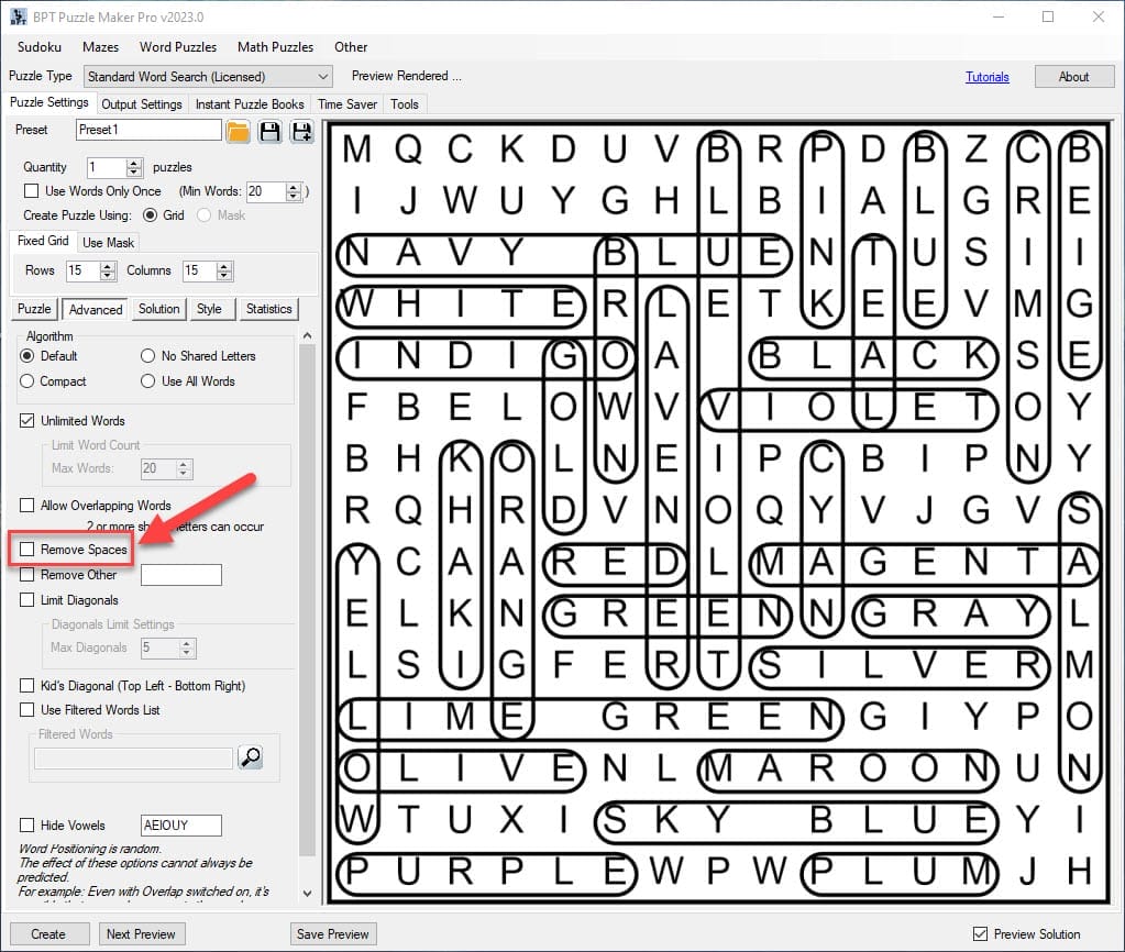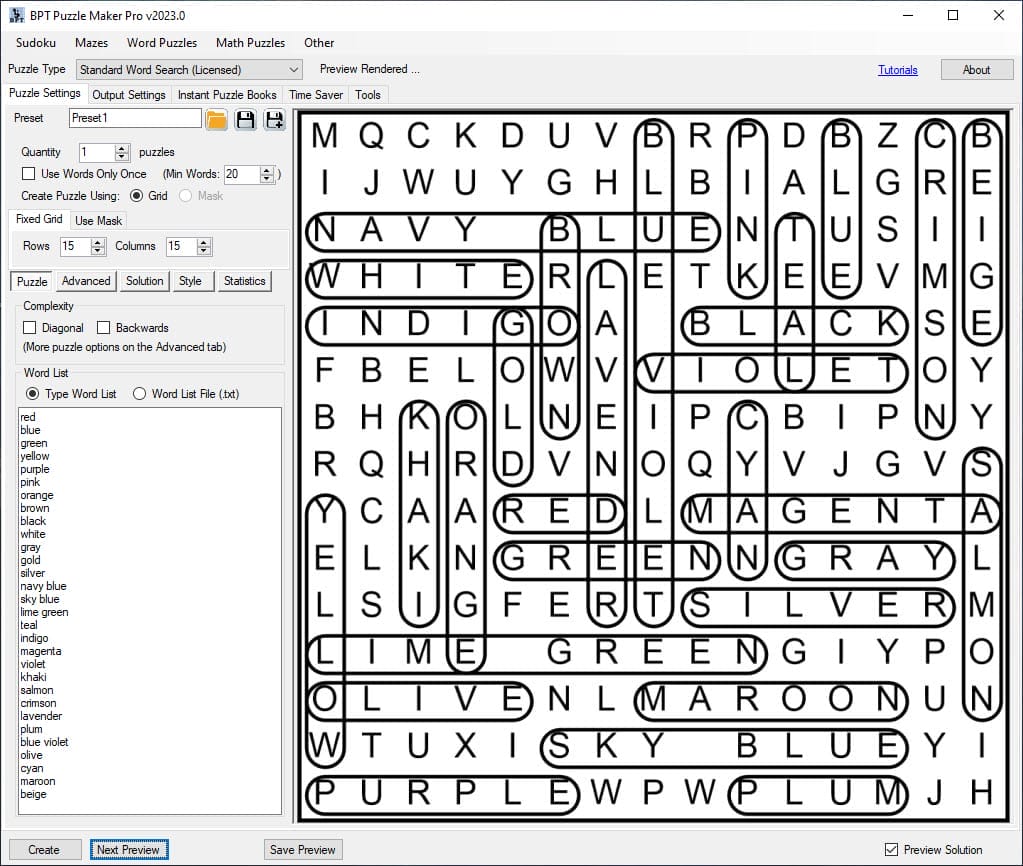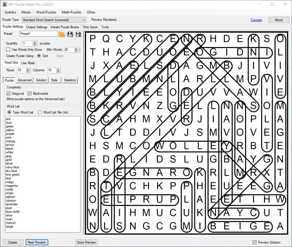 It’s also possible to fine-tune these options, but for now, let’s leave it at this. You can select “Save Preview” to export the puzzle and the word list, as well as a solution.
