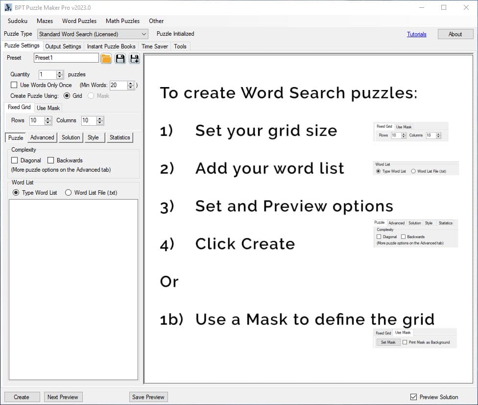 On the left of the screen we see all the options for creating puzzles. Some of the options may be greyed out or not appear, depending on the version you’re using. For example, Masks only work if you have the Mask Add-On for Standard Word Search, or one of the two bundles.