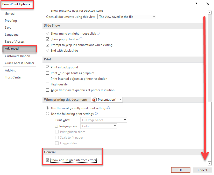 In addition to that, there’s an option to force Powerpoint to show Add-in error messages (which may be suppressed otherwise). We need these messages to figure out what’s going on.