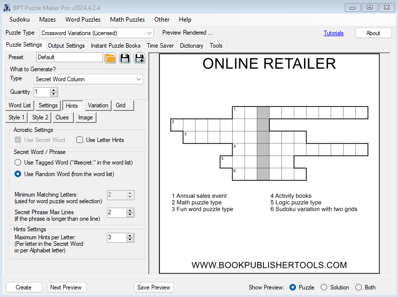 This tutorial shows how to create Secret Word and Letter Hint puzzles with Puzzle Maker Pro – Secret Word Column.