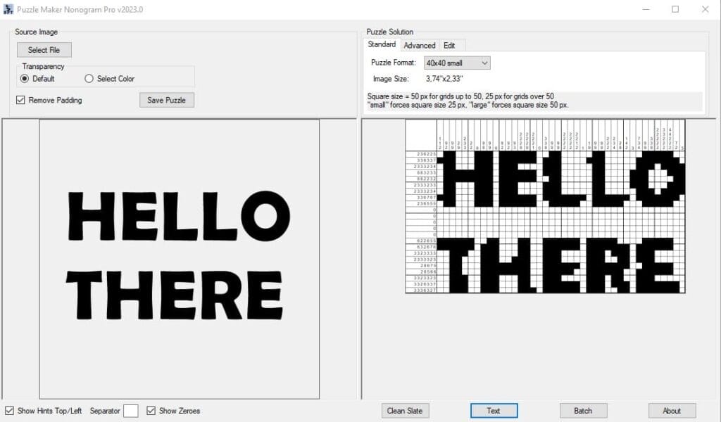 Welcome to the tutorial on how to create Nonograms with letters or words. This is possible with Puzzle Maker Nonogram Text.