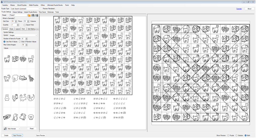 For Kids’ puzzles, it makes sense to use smaller grids and fewer symbols, and also set the number of copies for each code to 1 only.