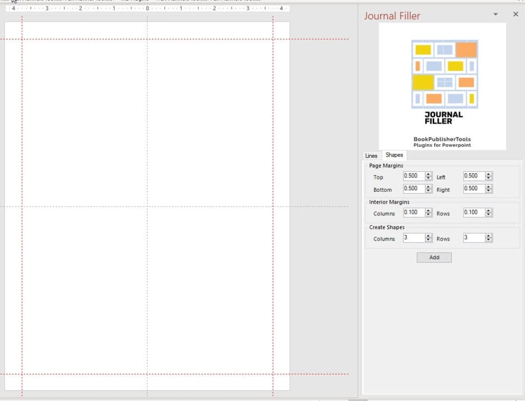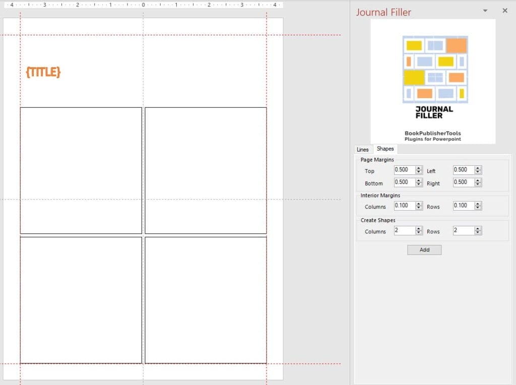 Journal Filler will create the specified number of shapes in the place of the selected shape. If you set the number of rows and columns both to 2, you will end up with 4 shapes, each approximately 50% of the height and width of the original shape. (It will apply the Interior Margins you set).