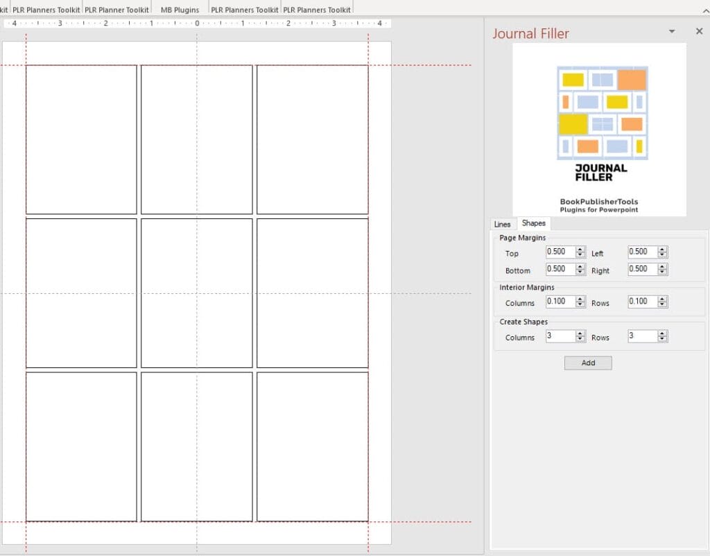 Journal Filler will create the specified number of shapes in the place of the selected shape. If you set the number of rows and columns both to 2, you will end up with 4 shapes, each approximately 50% of the height and width of the original shape. (It will apply the Interior Margins you set).