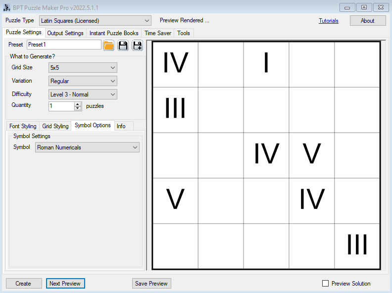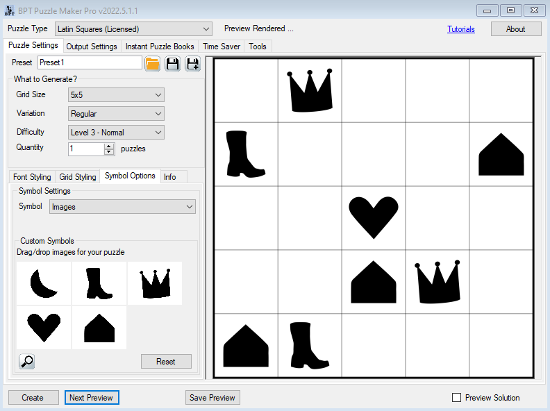 - To see the result of your changes click “Create” or “Next Preview” (4). Both will show a new puzzle, based on your settings. Next Preview is best while you’re still customizing the style and puzzle settings, this will not save the puzzle on your computer. Create will create a puzzle, save it to the computer and show it in the preview panel (5)