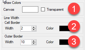 You can set the background (canvas) color (1), the color and weight of the outer border (3) and the color and weight of the inner lines / cell borders (2)