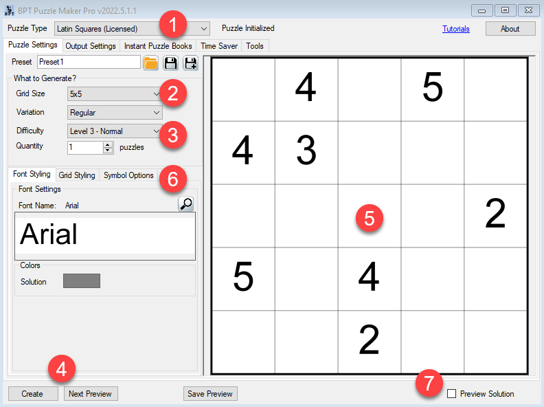 - Style options (6) – For Latin Squares there are several style option tabs: Font Settings, Grid Styling and Symbol Options.