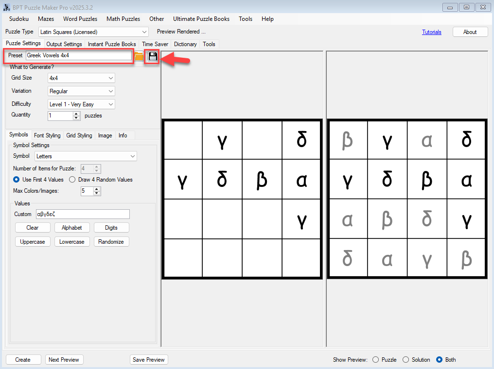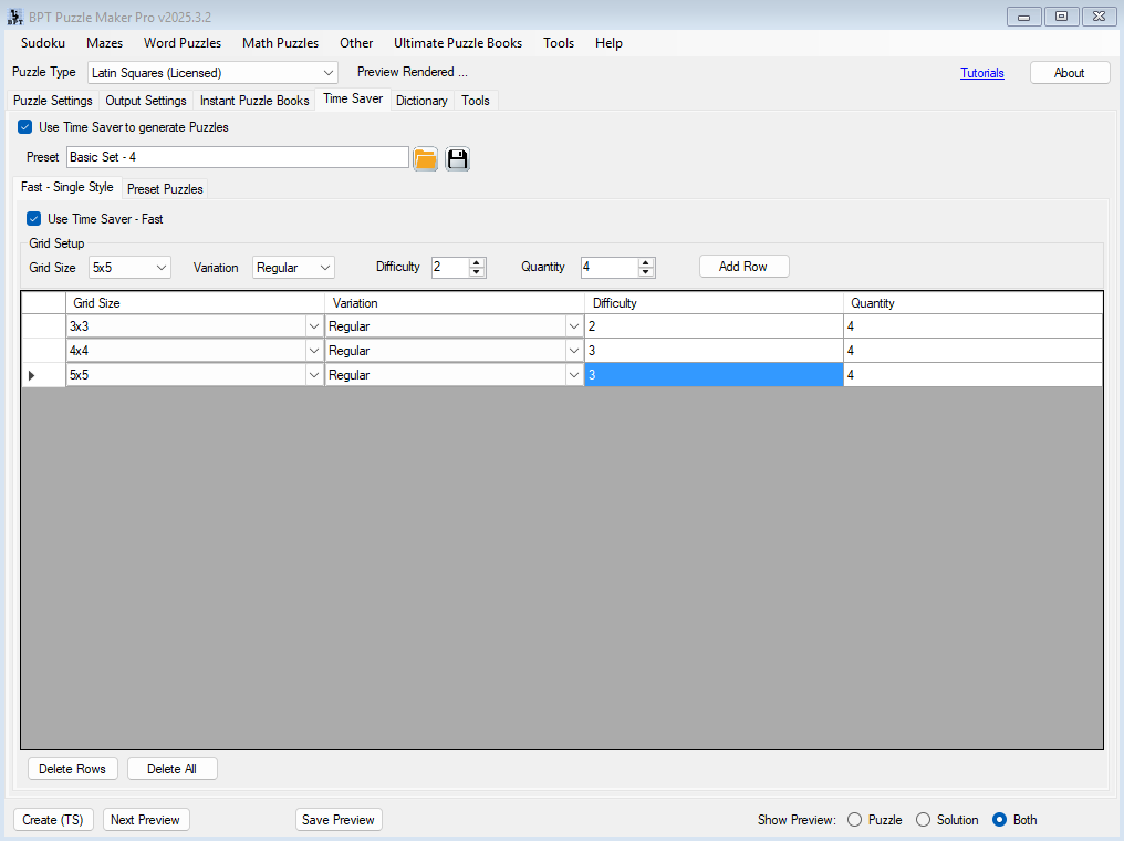 - Add a row per preset and define how many puzzles to create.