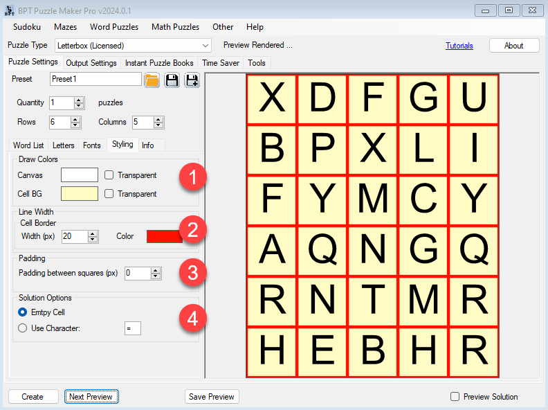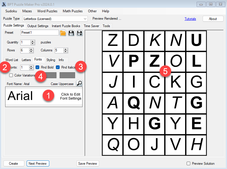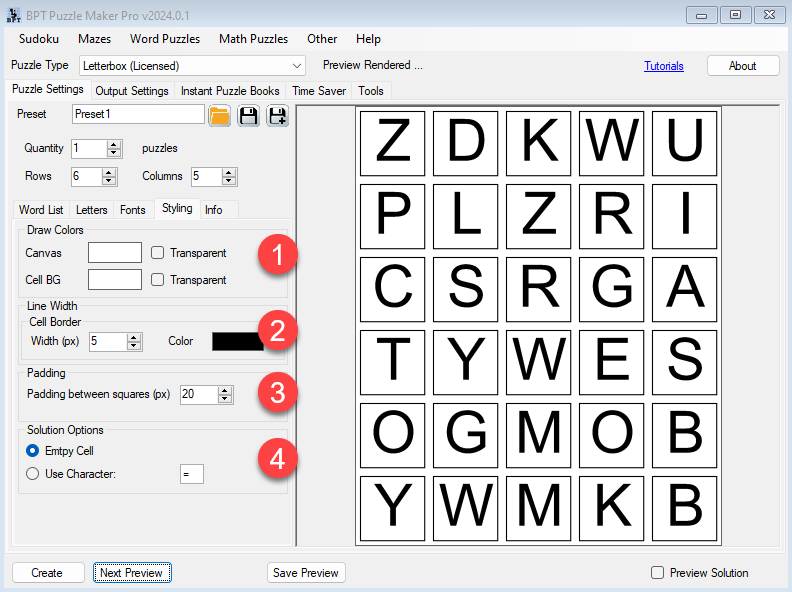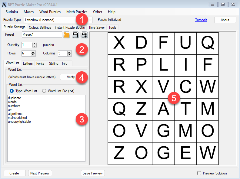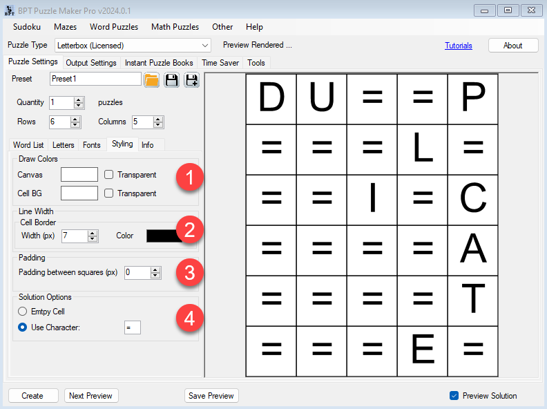 Here’s the same screenshot, with some numbers to clarify the different options. Additionally, the general Puzzle Maker Pro features such as Preview, Preview Solution, Output Settings, etc. are available.