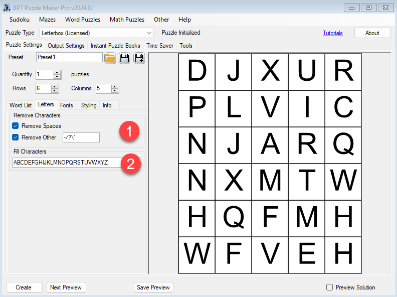 On the “Letters” tab you can find several options to control the letters that are used in your puzzle:
