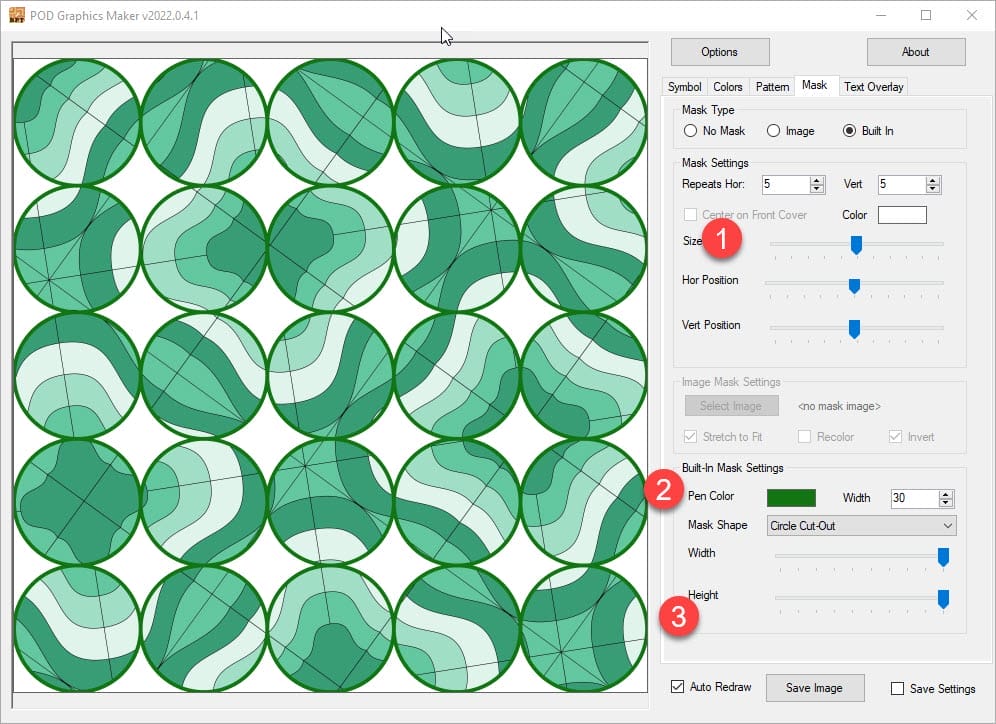 - Pen colour and mask shape. We’ve set the pen colour to a dark green to go with our colours in the background. We’ve used a circle cut out, meaning that everything is greyed out except the 5×5 circles. There are multiple mask shapes that come with the software.