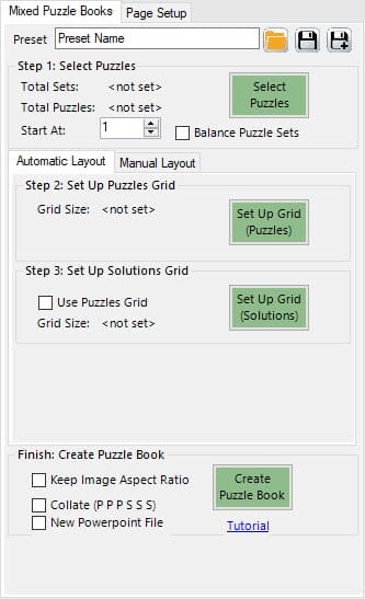 - Mixed Puzzle Books – All the options to create your puzzle book. This tutorial describes all the steps for automatic puzzle book creation, there’s a separate “Manual Book Creation” tutorial that explains how to manually edit the layout;