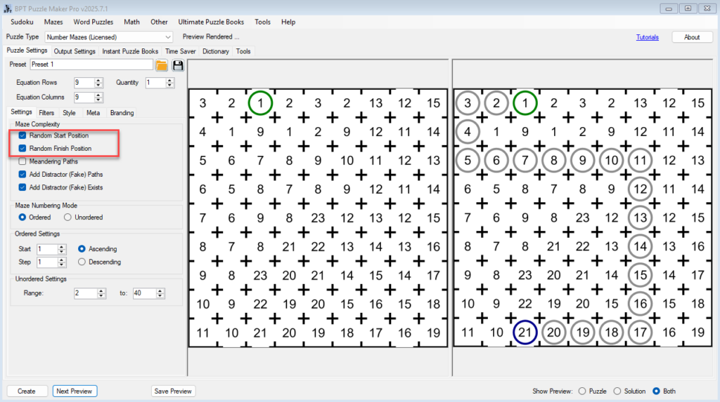 This tutorial shows how to adjust your maze’s complexity by enabling or disabling meandering paths, fake paths, fake exits, and random start/finish positions. These options dramatically change how the puzzle plays — even when the numbers stay the same.