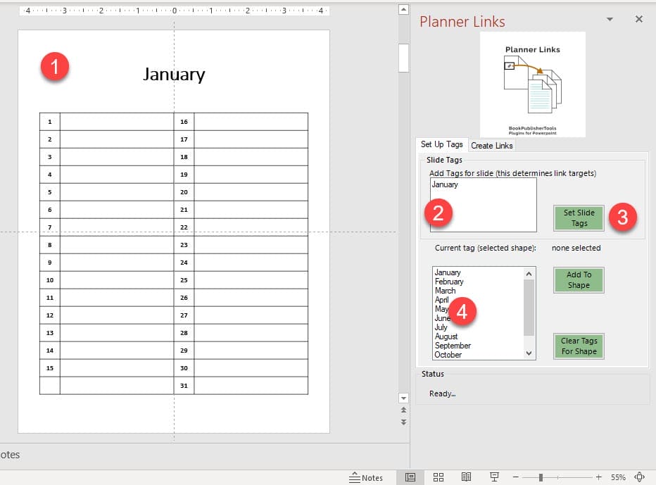 To add tags to a slide, select the slide in Powerpoint (1). This wil automatically display the active tags for that slide (2). There can be more than one tag for each slide: For example, the first slide for a calendar could have tags “Calendar” and “January”, while the second slide only has the tag “February”.