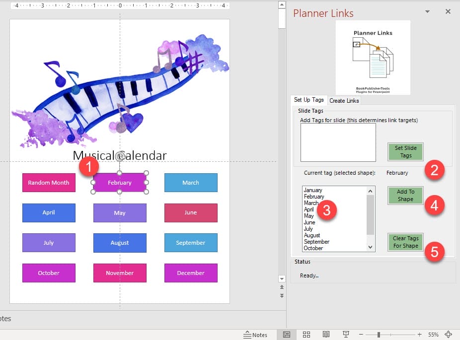 To add or change the tag for a shape, select the shape on your slide (1). After selecting it, you’ll see the current tag for that shape (2). If you want to change it, you can select a tag in the list (3) and click “Add to Shape” (4), or remove the tag from the shape (5).