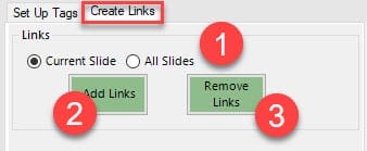 You can choose to add links to the current slide or to all slides in the Powerpoint file (including Master Slides) (1). To Add Links, click “Add Links” (2). This will remove old links and add new ones. To only remove existing links, click “Remove Links” (3).