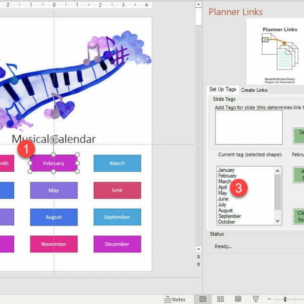 DescriptionFor many publishers, Powerpoint is the preferred tool to create Digital Planners. However, digital planners rely on internal links, to sections or pages. These internal links take quite a bit of work to set up and maintain, technically. Planner Links (Plugin for Powerpoint) helps you to create and manage your links. Just add tags to the slides (pages) you want to link to. For example “Calendar”, “Address Book”, “February”, “Emergency Contacts”. Use meaningful names to connect the buttons (shapes) and targets (slides), and generate the actual links and the supporting invisible shapes when you’re ready. Easy Peasy. Planner Links Plugin for Powerpoint will work with your MS Windows installed version of MS Powerpoint. | Ease of UseIt’s easy: