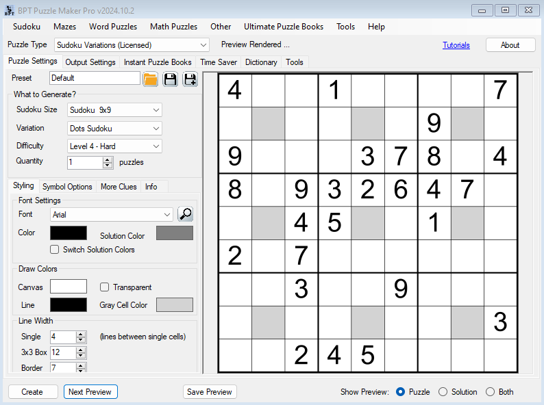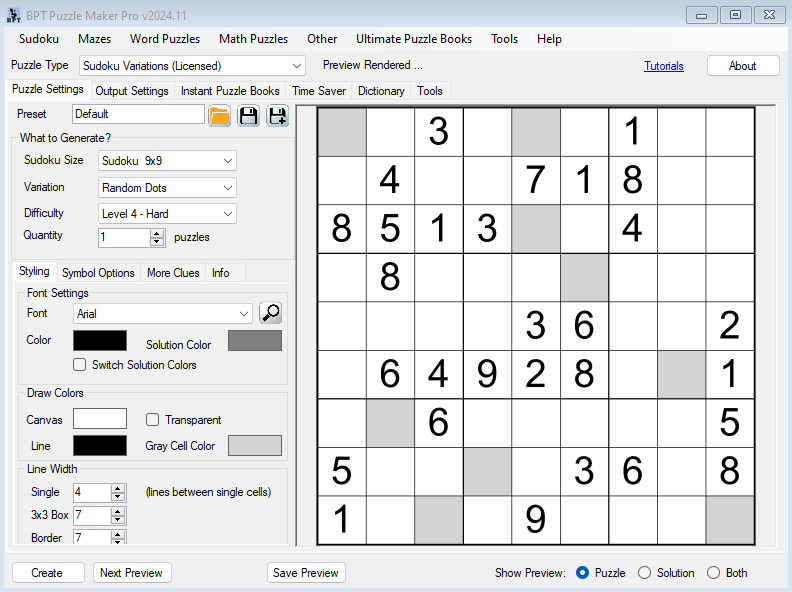 You can use any TrueType font that’s installed on your computer, change colors, line weight, and more, to create sudokus in your own unique style. By using the Preview button, you can see a sudoku puzzle and solution with the new style right away.