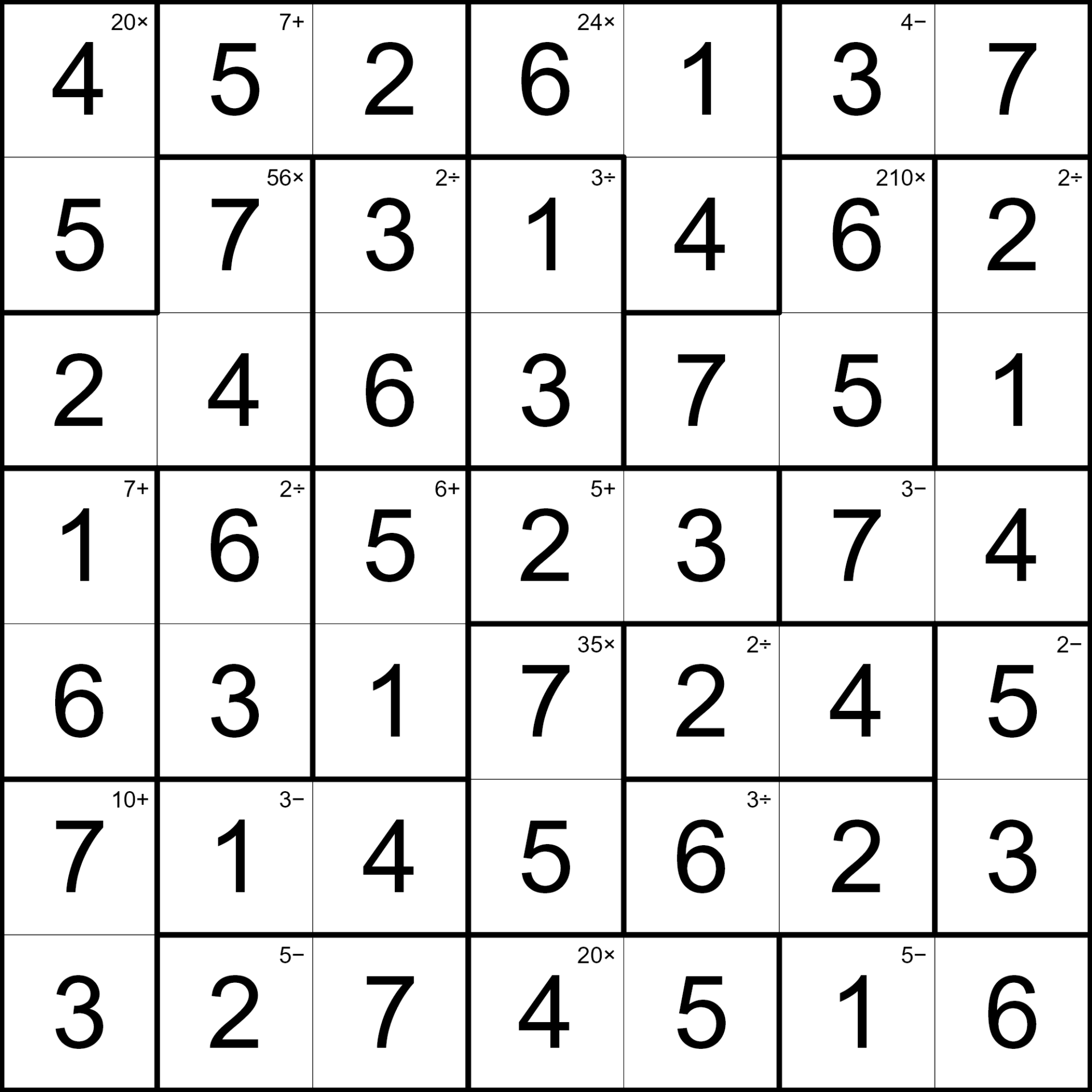 Solvers must fill the grid so each cage’s operation equals its target number while maintaining unique numbers across the grid.