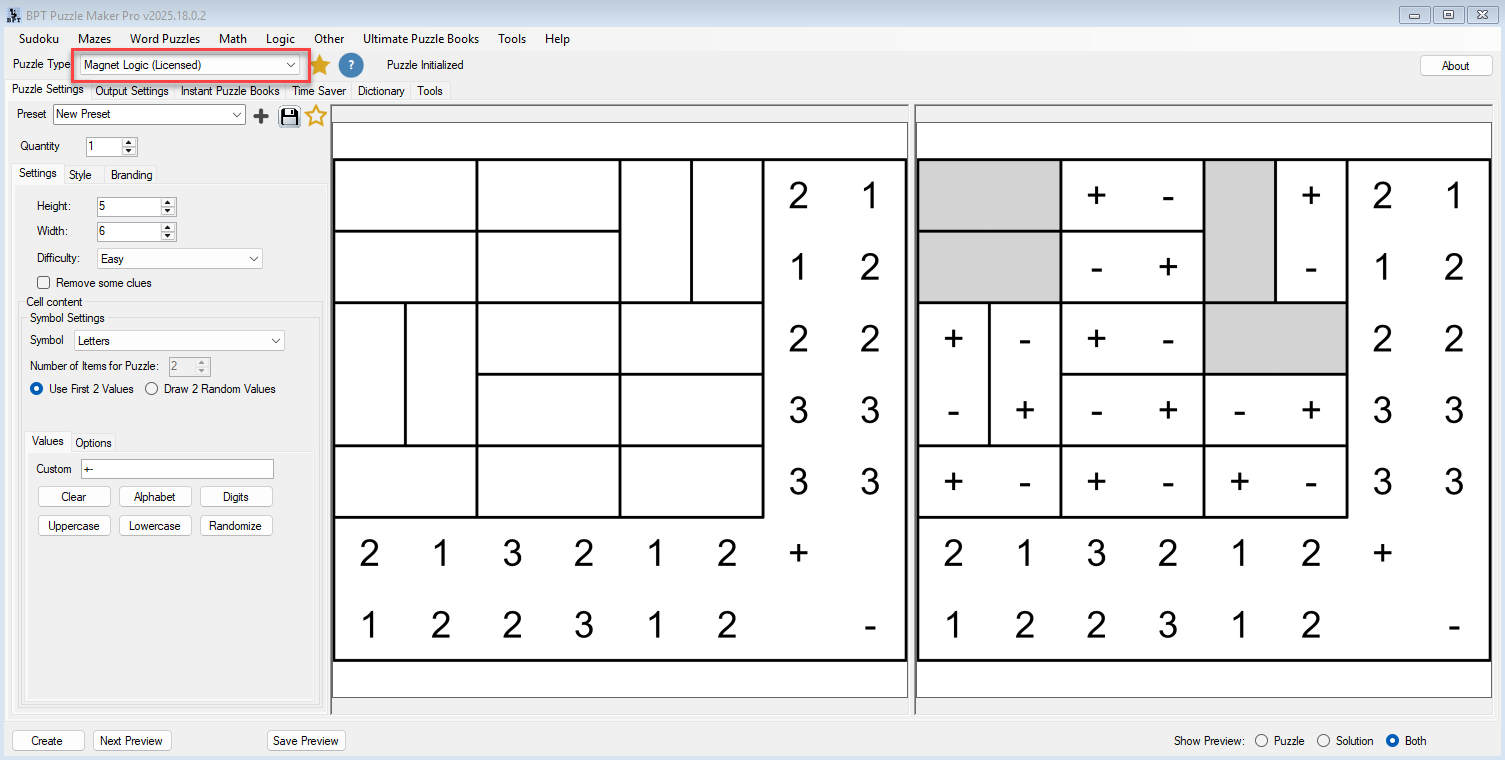| Two Complete Logic Generators | Create and export both Domino and Magnet puzzles from one purchase. |