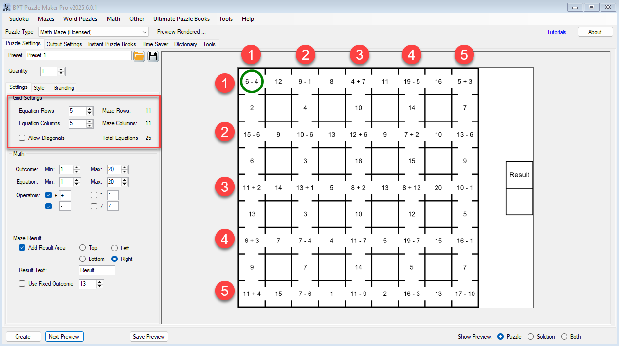 Create mazes with 2 to 5 rows and columns of equations. Choose the operators (+, –, ×, ÷), number ranges, and difficulty levels — or keep the smart defaults and click “Create.”