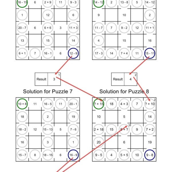- A small index appears in the result cell (e.g. “1”) and next to the question mark in the next puzzle’s equation.