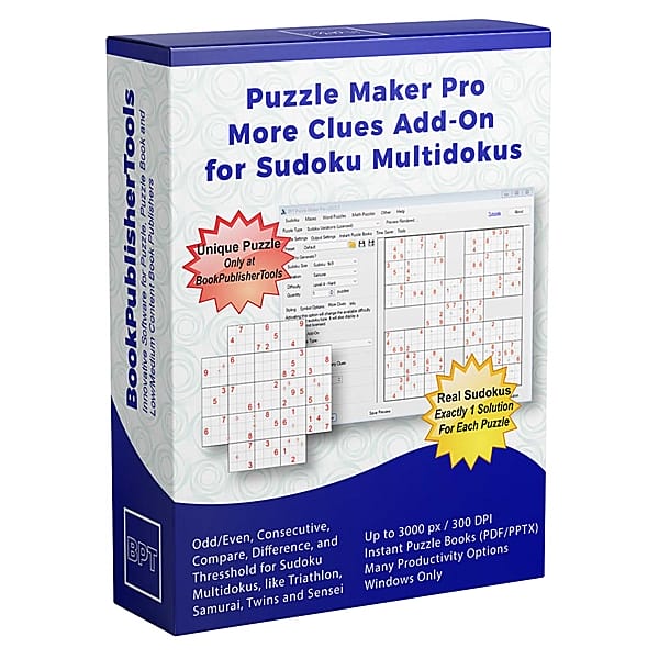 This product will enable the five new variations for all grid sizes except 9×9: (Sudoku Kids Edition, Sudoku Large Squares, Sudoku Large Squares and Sudoku More Squares). This will give you 5 new variations for each of these 12 grid sizes, a total of 60 new sudoku variations, with several difficulty levels for each. The More Clues Add-On will also work with the hexadecimal, letter and Roman numericals sudokus, giving you 180 additional variations. As a bonus, these variations will also work with 9×9 Checkerboard and 9×9 Nonconsecutive sudokus, giving you even more options. You’ll need licenses for these products as well to get puzzles without watermarks. But that’s not all. We understand the importance of customization, and with Puzzle Maker Pro – More Clues Add-On for Sudoku Other Grid Sizes, you have the power to personalize your puzzles to your heart’s content. Choose from a range of difficulty levels, allowing you to cater to both beginners and seasoned Sudoku enthusiasts. And with the ability to customize fonts and colors, you can create puzzles that are visually appealing and truly unique. Saving and sharing your puzzles has never been easier. Puzzle Maker Pro – More Clues Add-On for Sudoku Other Grid Sizes allows you to save your puzzles as JPG or PNG files, perfect for sharing on social media or printing for offline enjoyment. Additionally, you can create puzzle books in PDF and PowerPoint formats, making it effortless to share your puzzles with friends, family, or even sell them to eager Sudoku enthusiasts. Rest assured, Puzzle Maker Pro – More Clues Add-On for Sudoku Other Grid Sizes is designed exclusively for Windows software, ensuring a seamless and user-friendly experience. Whether you’re a casual Sudoku player or a professional puzzle creator, this add-on is the missing piece to your puzzle-making arsenal. Don’t miss out on this opportunity to elevate your Sudoku puzzles to new heights. Invest in Puzzle Maker Pro – More Clues Add-On for Sudoku Other Grid Sizes today and unlock a world of endless puzzle-solving possibilities. Get ready to impress and challenge your audience with captivating Sudoku puzzles that will keep them coming back for more. | Ease of UseIt’s easy to use – all our sudoku modules are available in the Sudoku Variations module in Puzzle Maker Pro. You can select your licensed variations or demo the other variations before purchase. To create your sudokus: